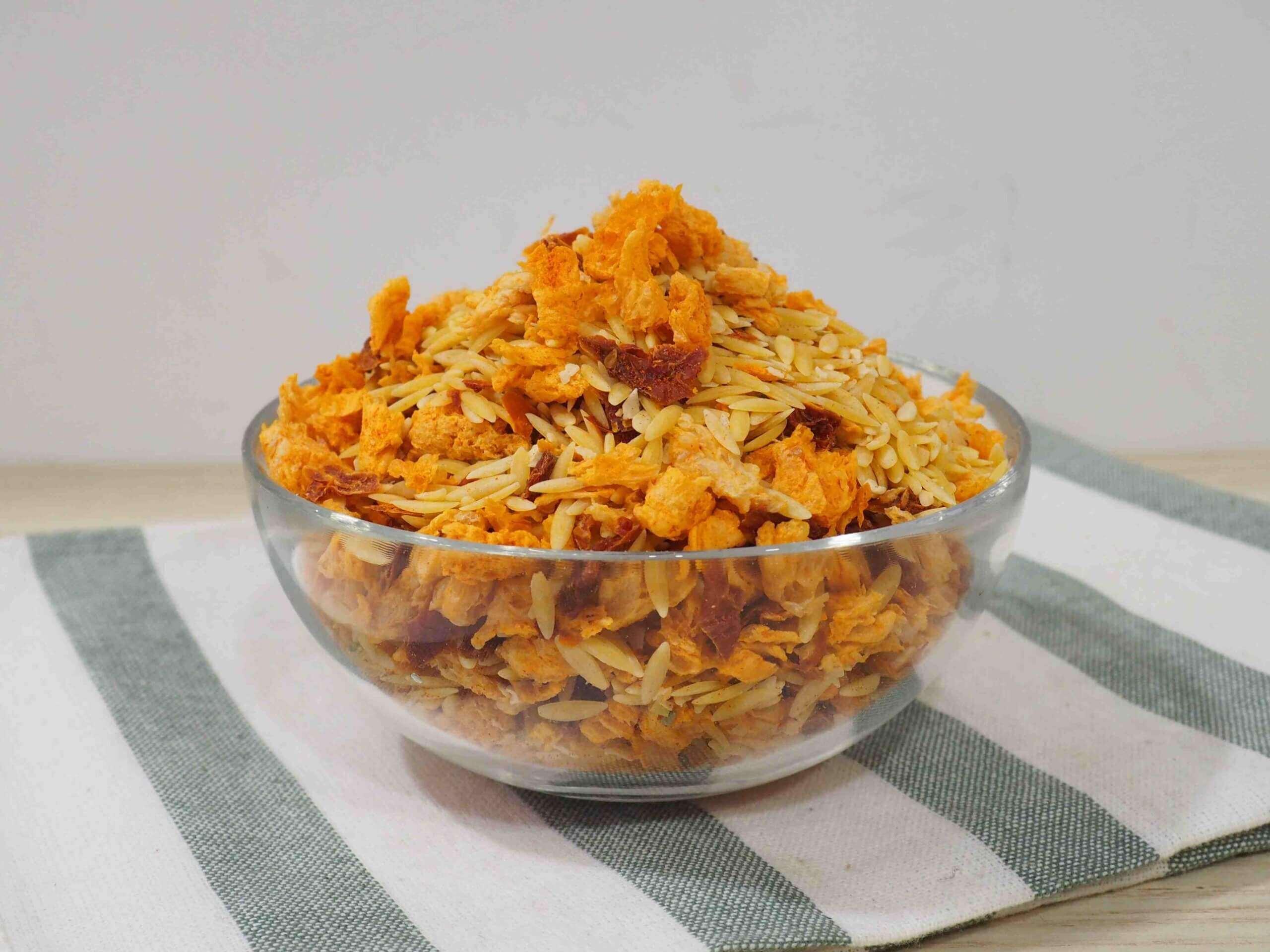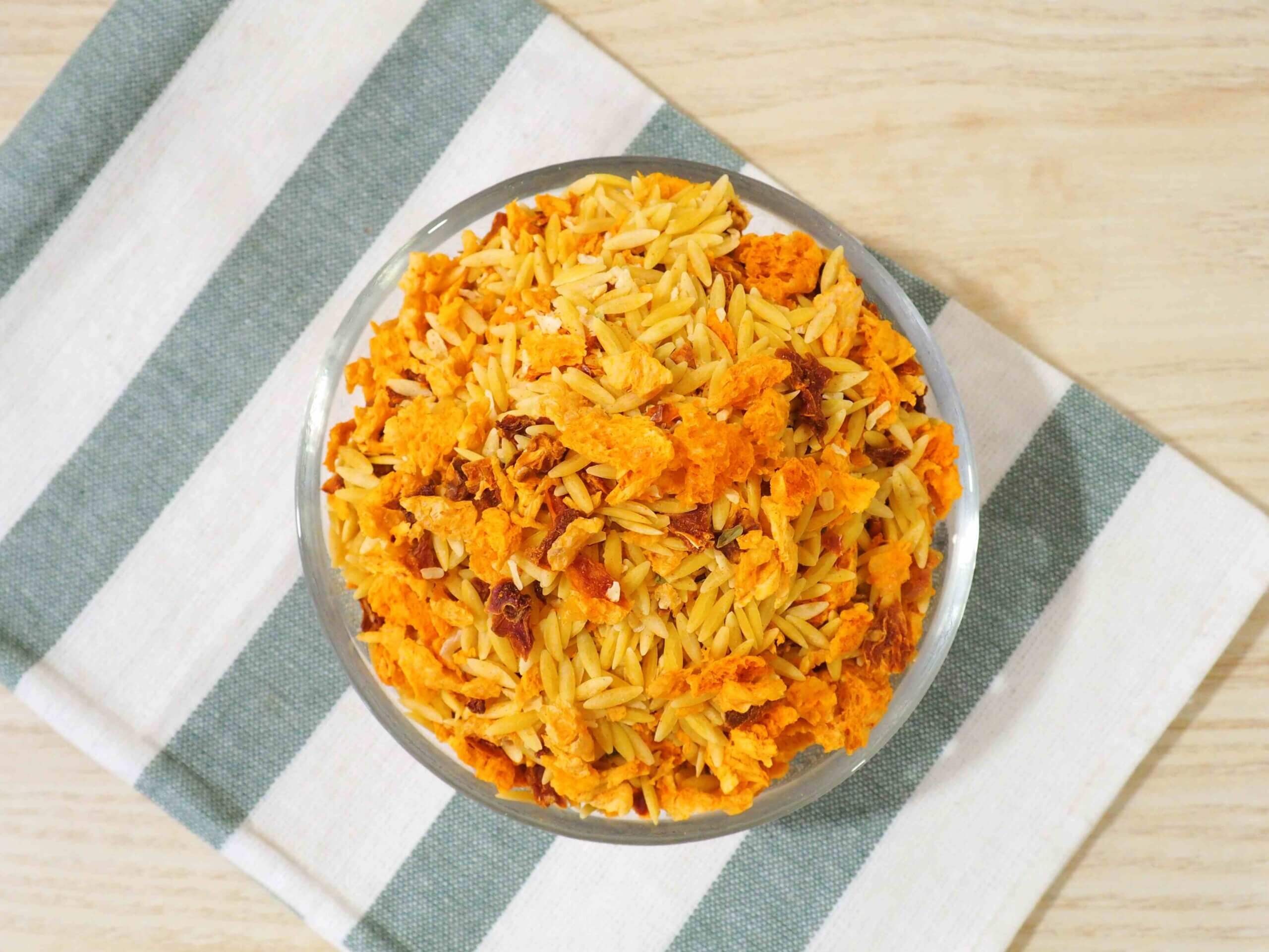 Ingredientes: Pasta (sémola de trigo), proteína de guisante texturizada, cebolla, tomate, ajo, pimentón, orégano.