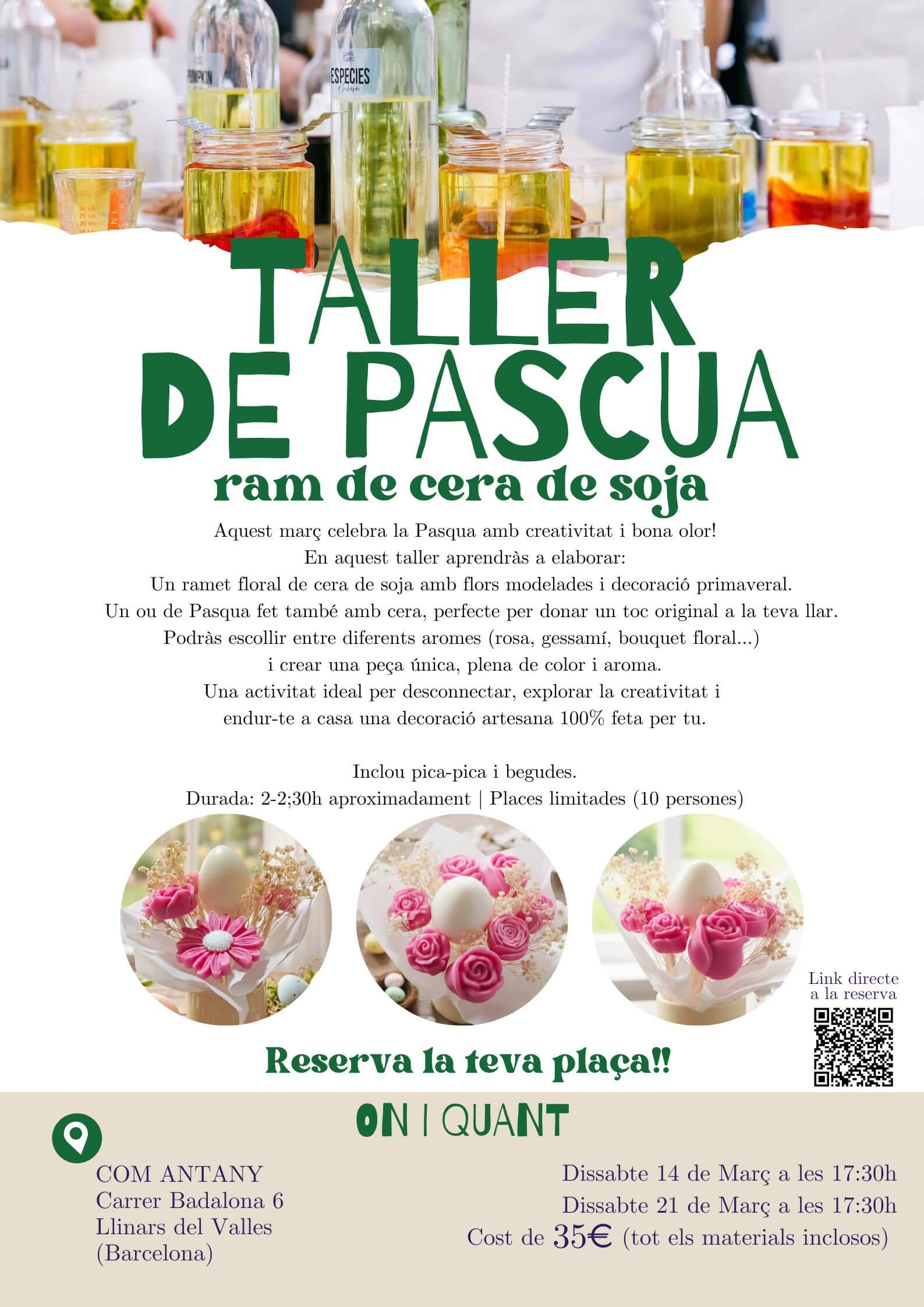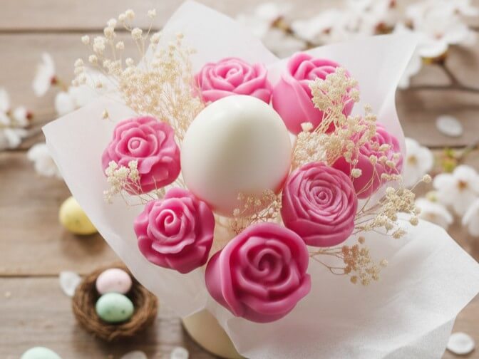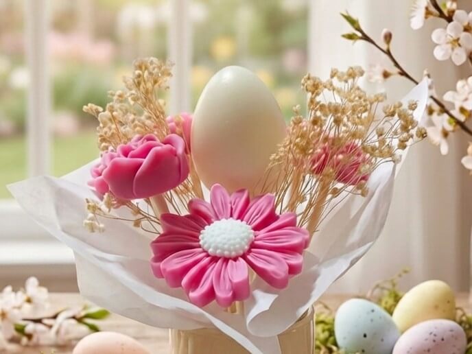 En este taller aprenderás a crear un bouquet floral de Pascua en cera de soja, trabajando con moldes de silicona y cera de alto punto de fusión para dar forma a flores y al tradicional huevo de Pascua, consiguiendo piezas resistentes y con un acabado cuidado.